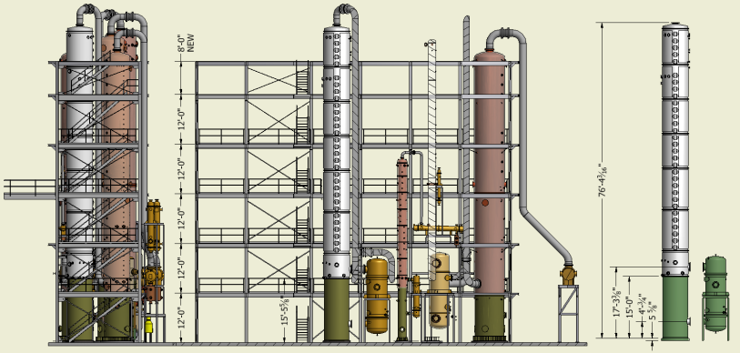 Distillation system is being upgraded from the ground up while utilizing the existing 6 story structure. It was important to survey and As-Build the entire system and adjoining area. The project took place in two phases to keep operations running. This is a multi-discipline project that Cadmaster Tech was contracted to run Project Management Modeling to control the General Arrangement and produce a model capable of clash detection. The 70 foot tall tanks contained over 100 nozzles each and required close contact with the still manufacturer to ensure the stills would fit in the existing structure. The footings needed to be enlarged to bring the existing structure into compliance with existing regulations. A 7th level was added to the still structure to accommodate the larger tanks.