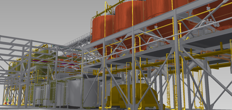 Cadmaster Tech was contracted to take engineering plans from multiple companies and create a master model for clash detection. We modeled from the bulk dump system to a 24 tank system with 2 massive bladder presses on rail road tracks below the fermenter tanks. There were several screw conveyors and a large pipe rack and tower that traveled through the fermenter structure. This was a complex system laced with pipes. We were able to identify several clashes and give design suggestions to reduce change orders and save the client time and money.